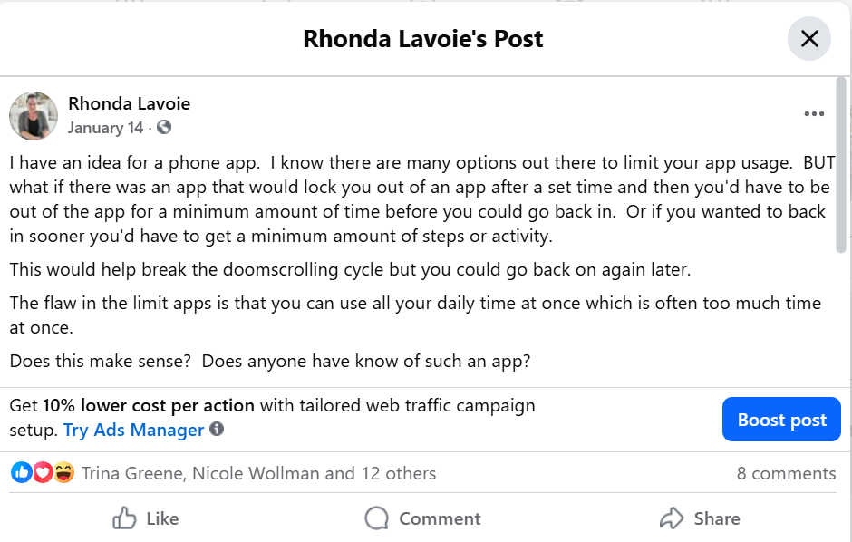She posted a simple question to her Facebook network: "What if an app locked you out, but let you earn time back sooner if you got a minimum amount of steps?" The concept resonated immediately, proving there was a real market gap.